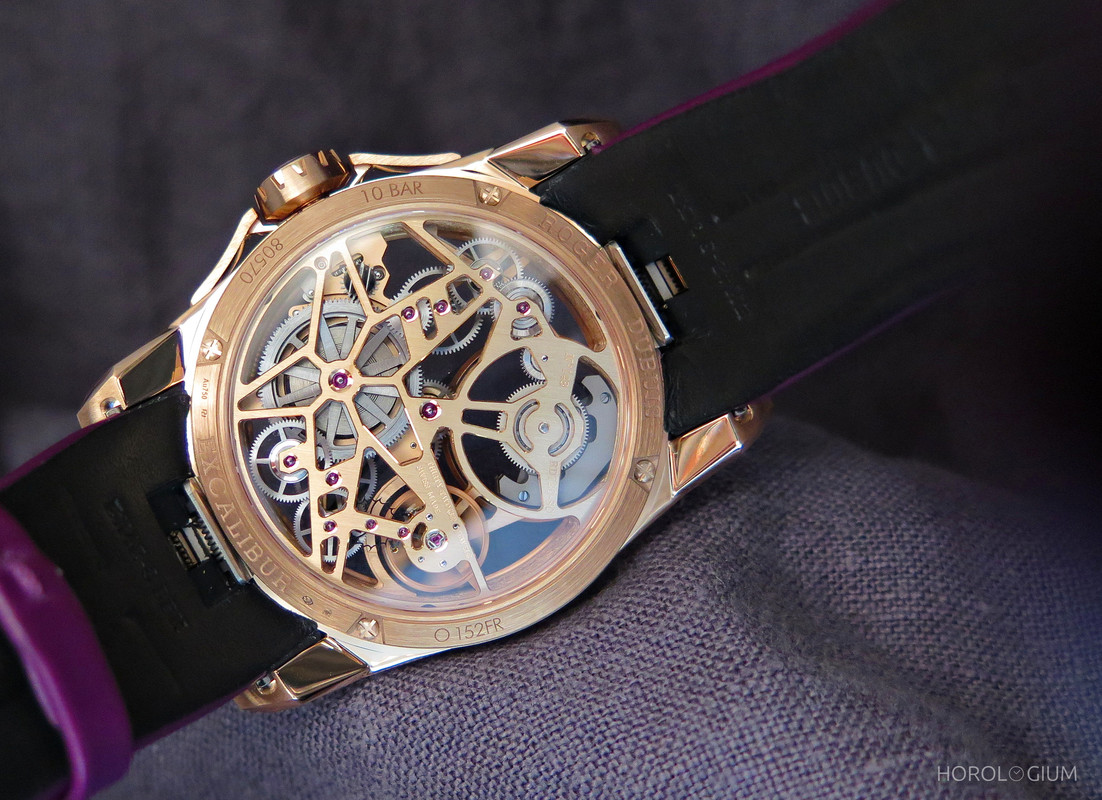 The new Excalibur Monobalancier EON Gold™ has a new automatic RD 720SQ movement with an also newly designed micro-rotor with the Dubuis logo, beating at 28,800 VPH and with a power reserve of 72 hours. Finishing includes shot-blasting and circular graining and the surfaces of the skeletonised movement are a mix of pink gold, and PVD and NAC coating.