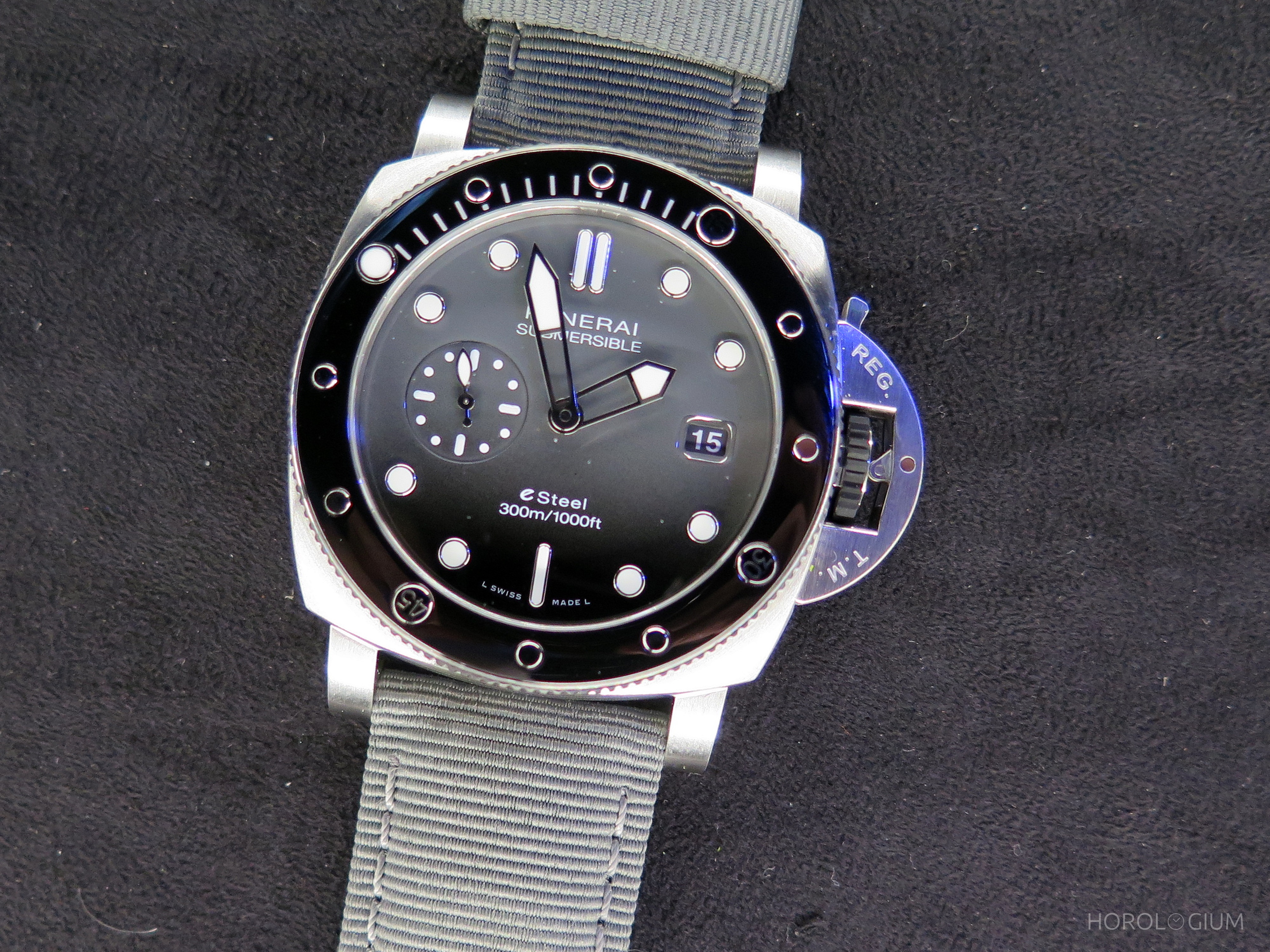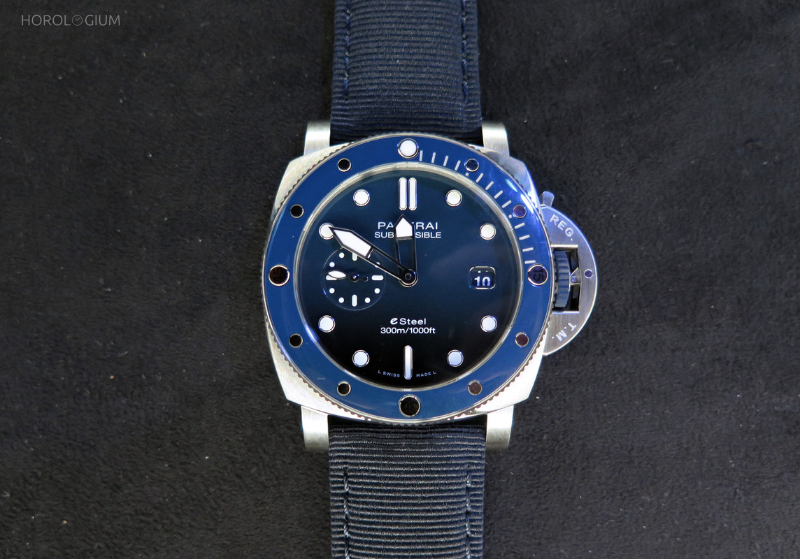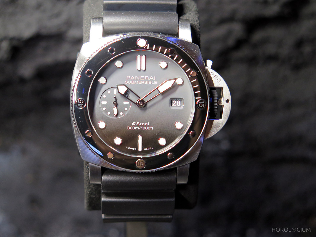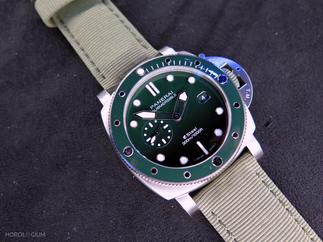 This year, they are expanding the use of eSteel™ with the introduction of the Submersible QuarantaQuattro, the first time this case material has been used in the Submersible line. Just as a reminder, eSteel™ has the same properties as conventional steel.