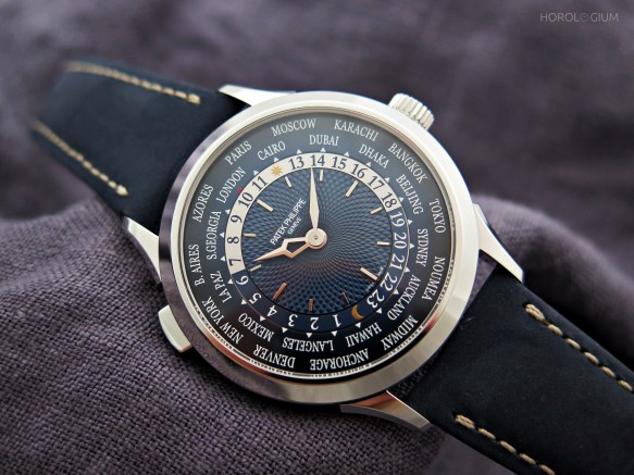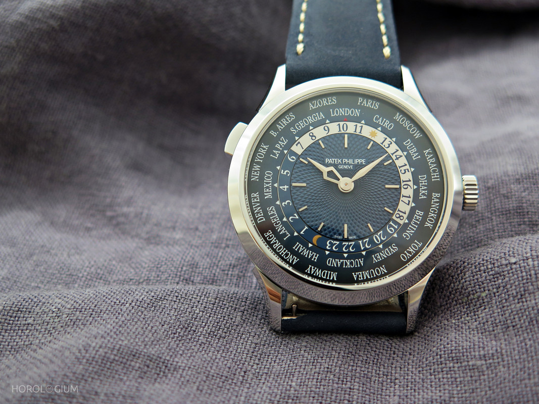 Visible through the case back is the automatic Calibre 240 HU with a 22k gold micr-rotor which beats at 21,600 VPH and has a power reserve of 48 hours. This is, of course, the same movement used in the other 5130s, but also other Patek world time models as well.