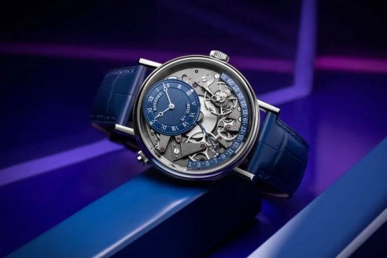 Inside the 40mm white gold case is the automatic Calibre 505Q, which has an inverted lever escapement and silicon horns. It beats at 21,600VPH and has a power reserve of 50 hours. Through the open case back you can see gold oscillating weight whose shape is a historical nod to the one on the perpétuelle watch created by Abraham-Louis Breguet in 1780.