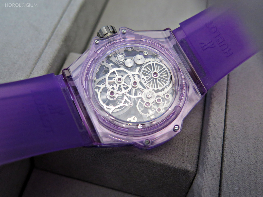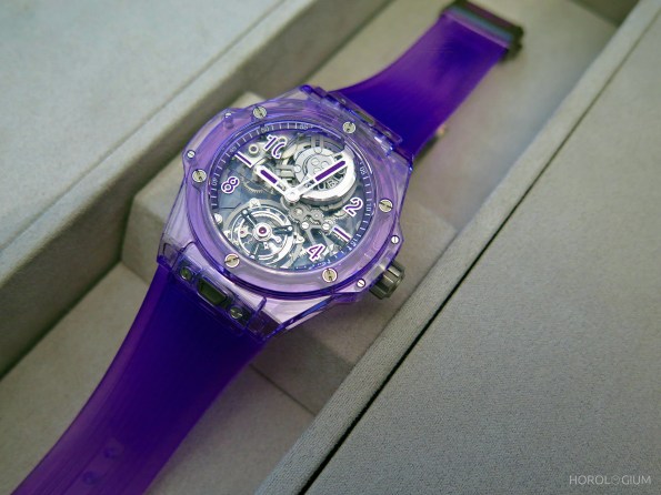 The matching transparent purple rubber strap has Hublot’s One Click system and a titanium folding deployant clasp. For those who have never tried on one of Hublot’s sapphire watches, they are, as expected, very light on the wrist.