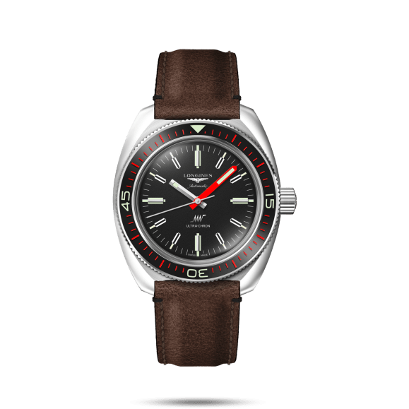 In 1968, Longines launched the Ultra-Chron Diver, the first dive watch to be equipped with a high-frequency movement. With a water resistance of 200m, it was in a cushion case and featured a red minute hand. It is the 1968 Diver which forms the inspiration for this new model.