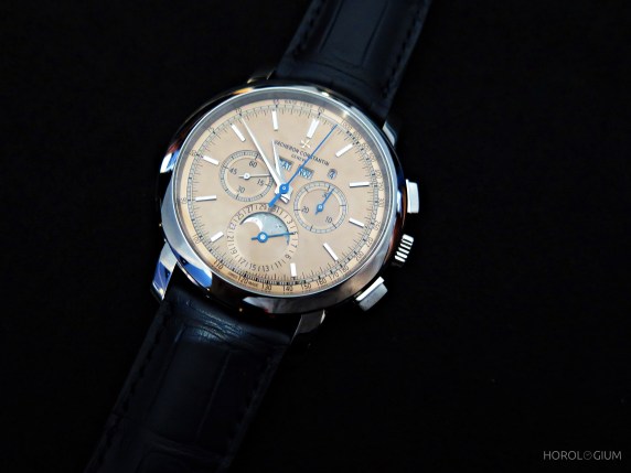 The case of this new model is 43mm with a thickness of 12.94mm, and in 950 platinum, with water resistance of 30m. As the name states, it is a combination of two complications. So along with the hours and minutes and a small seconds ta 9 o’clock, we have a perpetual calendar, with a leap year indication of course, moonphase, and chronograph.