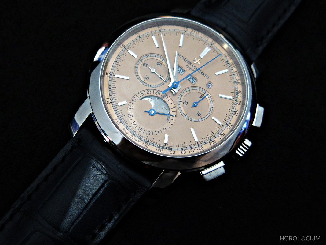 Now, they have a new addition, which (for the time being, anyway – who knows what he future will bring), sits at the top of the Platine tree. Combining the platinum case with a salmon-coloured dial, meet the Traditionelle Perpetual Calendar Chronograph.