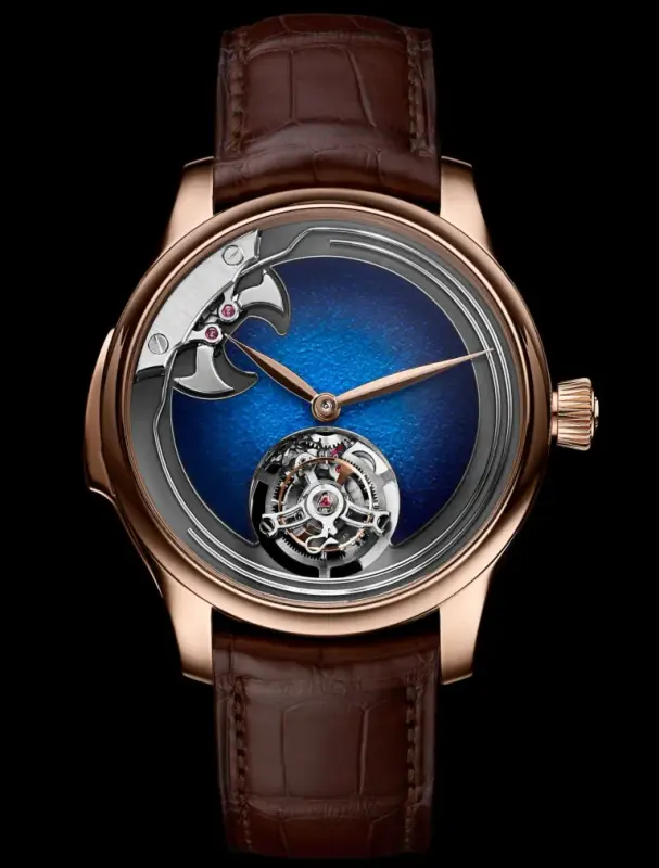 Now there are two new variations on the Endeavour Concept Minute Repeater Tourbillon model. This time, in a 40mm case in either 5N 18k red gold or titanium, but both with an aqua blue dial that features grand feu enamel on a hammered surface. The earlier model was 14mm thick but these two new watches are 13.5mm thick.
