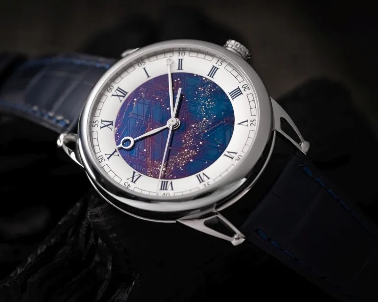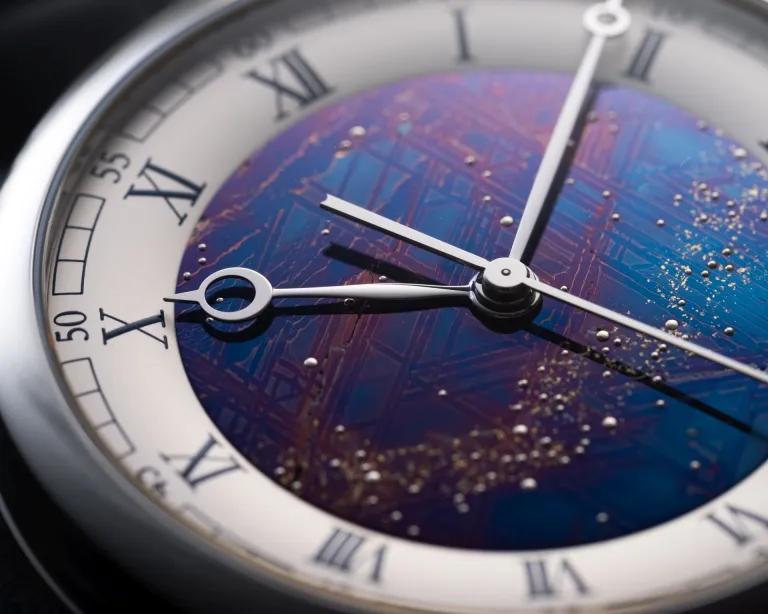 Muonionalusta meteorite was first used by De Bethune for the DB28XP Meteorite. For this new piece, the starry sky featuring the Milky Way is on a blued and polished meteorite dial. It also has a number of white gold pins of different sizes scattered across the sky, depicting stars. As you may be familiar with, when it comes to the Starry Varius, the customer can personalise it with their own constellation or part of the sky. The hands are hand-polished steel and the hours and minutes ring is silver-toned, both as in line with the DB 25 Starry Varius model in general.