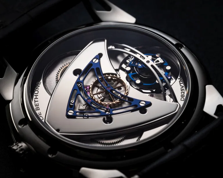 The case is 42mm and made from polished grade 5 titanium. Through the open case back can be seen the manually-wound Calibre DB2109V4, which beats at 36,000VPH, has a four day power reserve, and features a 30 second tourbillon made from silicon and titanium. The titanium patented balance wheel has small white gold inserts.