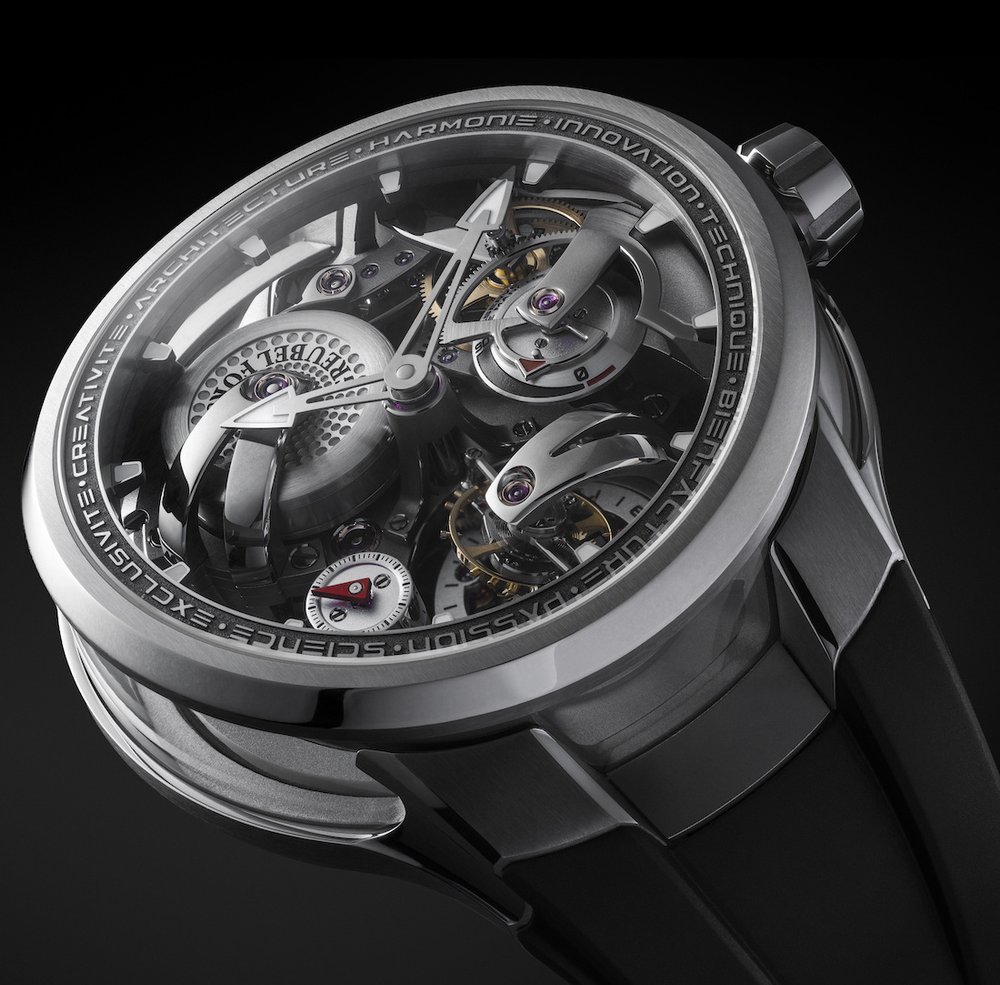 The convex shape of the case is wider at the case back than the bezel – 47.05mm at the case band and 45mm at the bezel, with a thickness of 16.8mm and water resistance of 50m. The skeletonised dial is surrounded by a bezel with relief engraved text of the following words – Architecture, Harmonie, Innovation, Technique, Bienfacture, Passion, Science, Exclusivité, Créativité.
