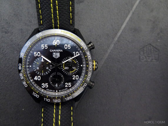 Based on the TAG Heuer Carrera Sport Chronograph with its in house Calibre Heuer 02. Functionally, along with the time, the chronograph has 30 minute, 12 hour, and 1/4 second counters.