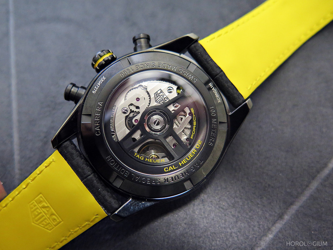 Through the sapphire case back can be seen the automatic Calibre Heuer 02 column wheel chronograph movement, which beats at 2,800 VPH and has a power reserve of 80 hours. The oscillating mass has “Porsche” and “TAG Heuer” in the same yellow as the front.