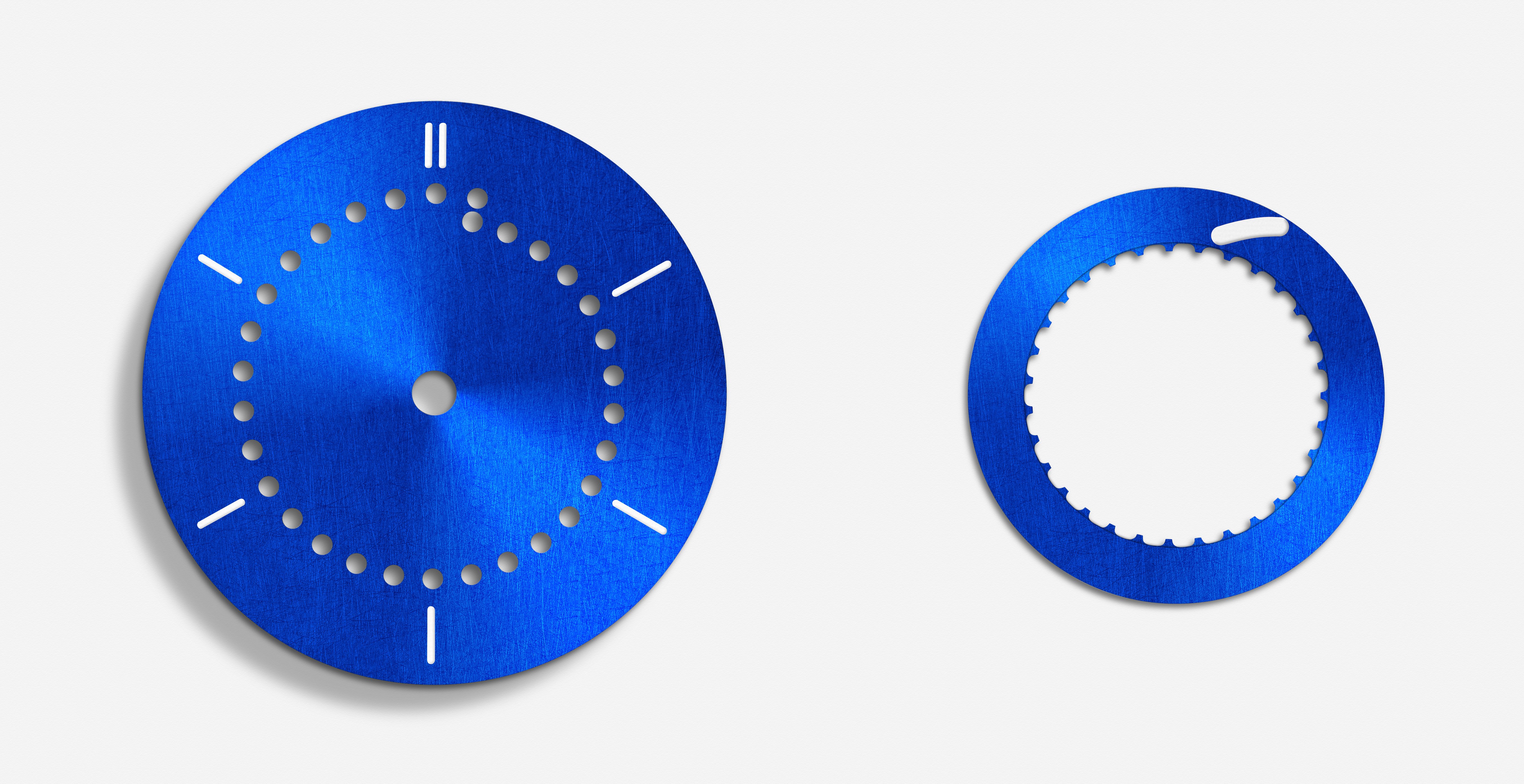 The Yves-Klein blue dial is made by Positive Coating, who are in La Chaux-de-Fonds. The blue PVD dial and month disc are paired with white indices, hands, and a white date indicator dot. The indices, hands and date dot all have white Super-LumiNova.