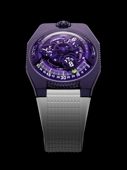 The UR-100 design has been a popular one for URWERK since its launch, and the new UR-100V Ultra Violet brings a new colour to the UR-100V family in a sanded shot-blasted titanium case.