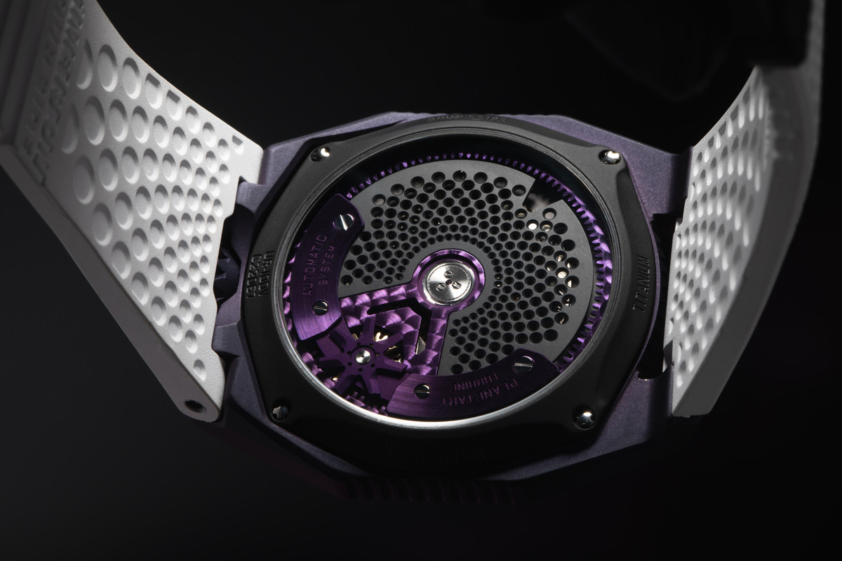 The case is a violet-coloured DLC sanded shot-blasted titanium, and measures 41mm x 49.7mm x 14mm. It is water resistant to 30m.