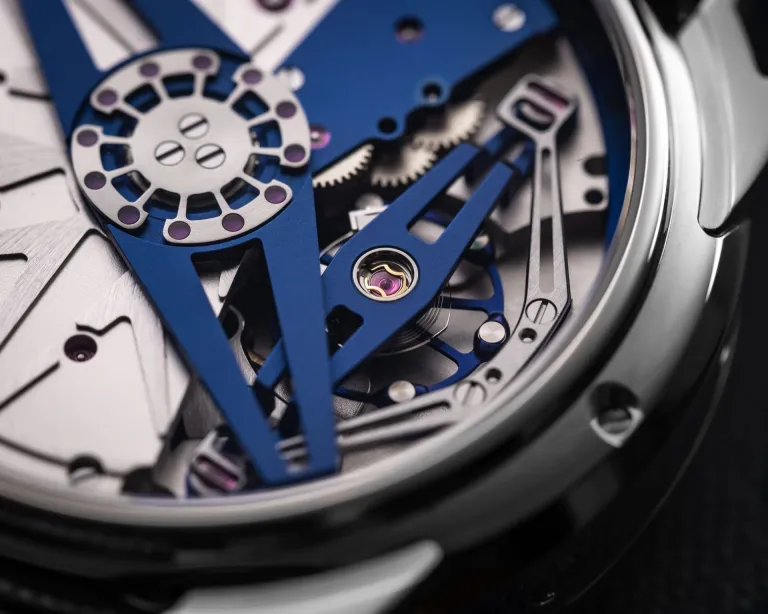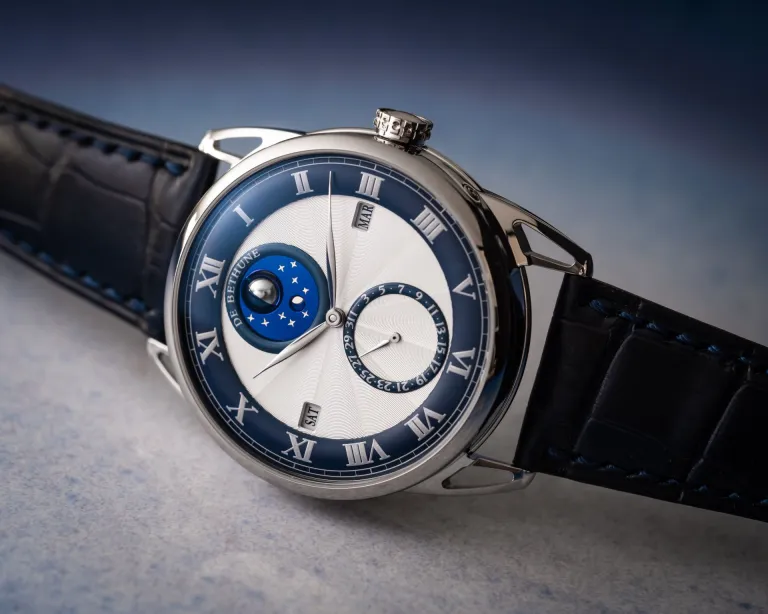 The hand-guilloché dial features a pattern radiating across 12 sectors, with blue appliques, silver-toned raised transfers, and Roman numerals. At 12 o’clock there is a palladium and blued steel spherical moon phase set against a sky dotted with rose gold star studded sky in blued titanium, along with a gold leap year indicator. The perpetual calendar indicators are the month at 3 o’clock, the date at 6 o’clock, and the day of the week at 9 o’clock. The curved hour, date and moon phase rings have silver relief Roman numerals. The hands, in mirror-polished steel, as also curved.