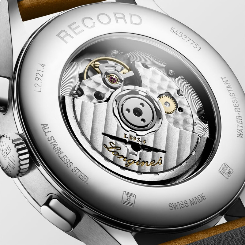 Behind the open case back can be seen the automatic COSC-certified Calibre L895.4 which beats at 28,800VPH and has a power reserve of 59 hours. It is based on the ETA 2892-A2, but this particular tweaking is making its first appearance in a Longines watch.