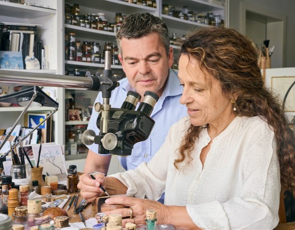As she is more familiar for her work for watch brand clients, it is fascinating to see, when given the opportunity and a blank dial, what she has chosen to do. On an 18kt white gold dial, the Grand Feu enamel painting she has chosen is (literally and figuratively) drawn from two inspirations – botanical illustrations and traditional Chinese paintings. A more fluid and organic design than the work for which she is more known.