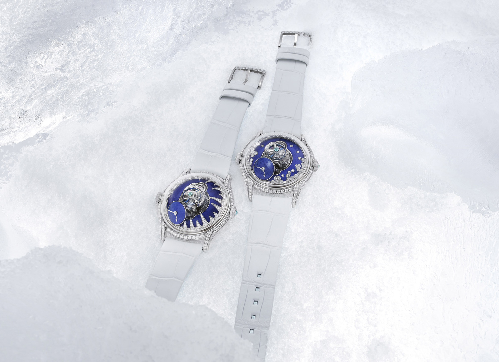 ‘Ice’ features asymmetrical diamond-set stalagmites that progress onto the sapphire crystal dome and the movement. Replicating their natural inspiration, each stalagmite is different. For this model, Tarpin took his inspiration from a trip to Lake Baïkal in Southern Siberia.