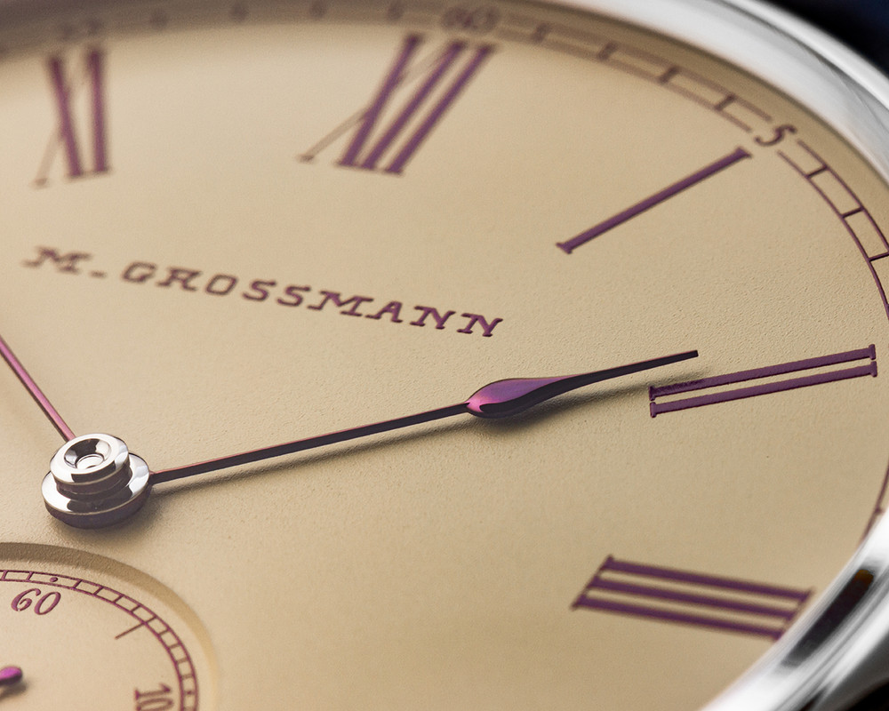 The case is 41mm and in 18kt white gold, with a thickness of 11.3mm. The dial is solid silver, cream-coloured (a nod to historic pieces) and lacquered, with Roman numerals and a historic Moritz Grossmann logo (1875).