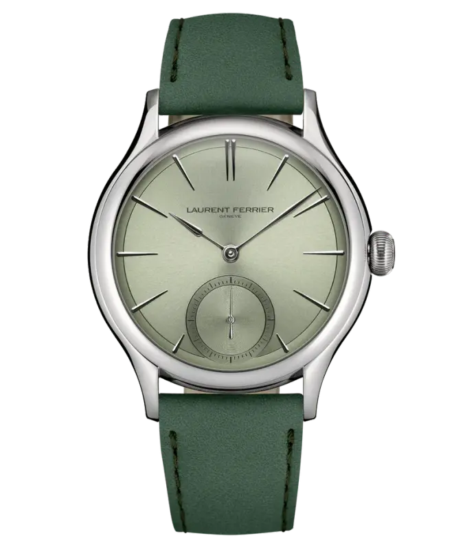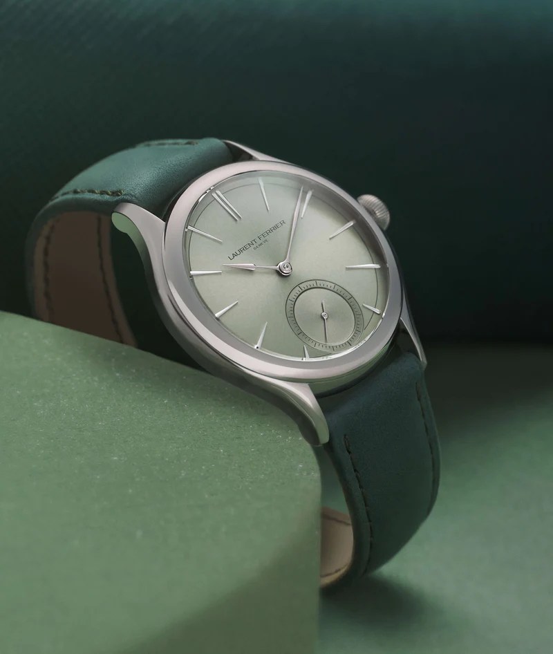 The focal point, the green dial (not the brand’s first, as we’ve covered before), has a sunray finishing – sunburst in the centre, and circular satin-brushed at its outer. The seconds sub dial has a snailed pattern, with both Laurent Ferrier’s signature Assegai-shaped hands and the indices in 18ct white gold.