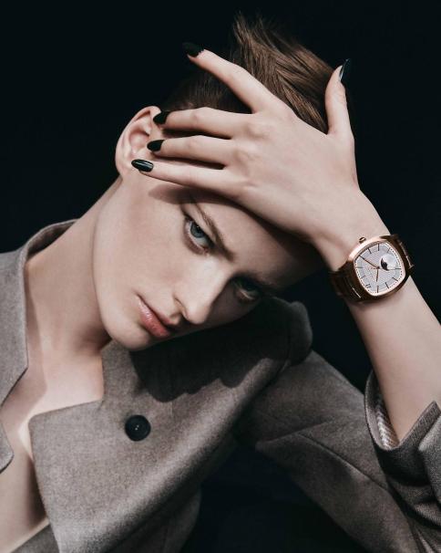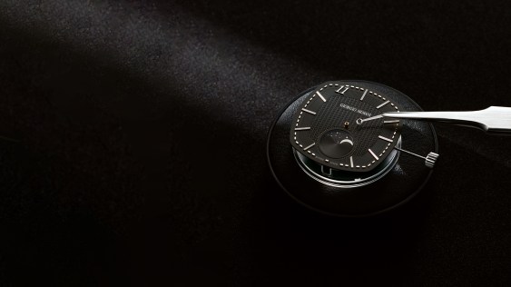 The dials have, along with the time and a centre seconds, a moon phase at 6 o’clock. The ‘11’ of the name is indicated by an Arabic 11 interrupting the indices at 11 o’clock and the fashion nod is the stamped herringbone pattern.