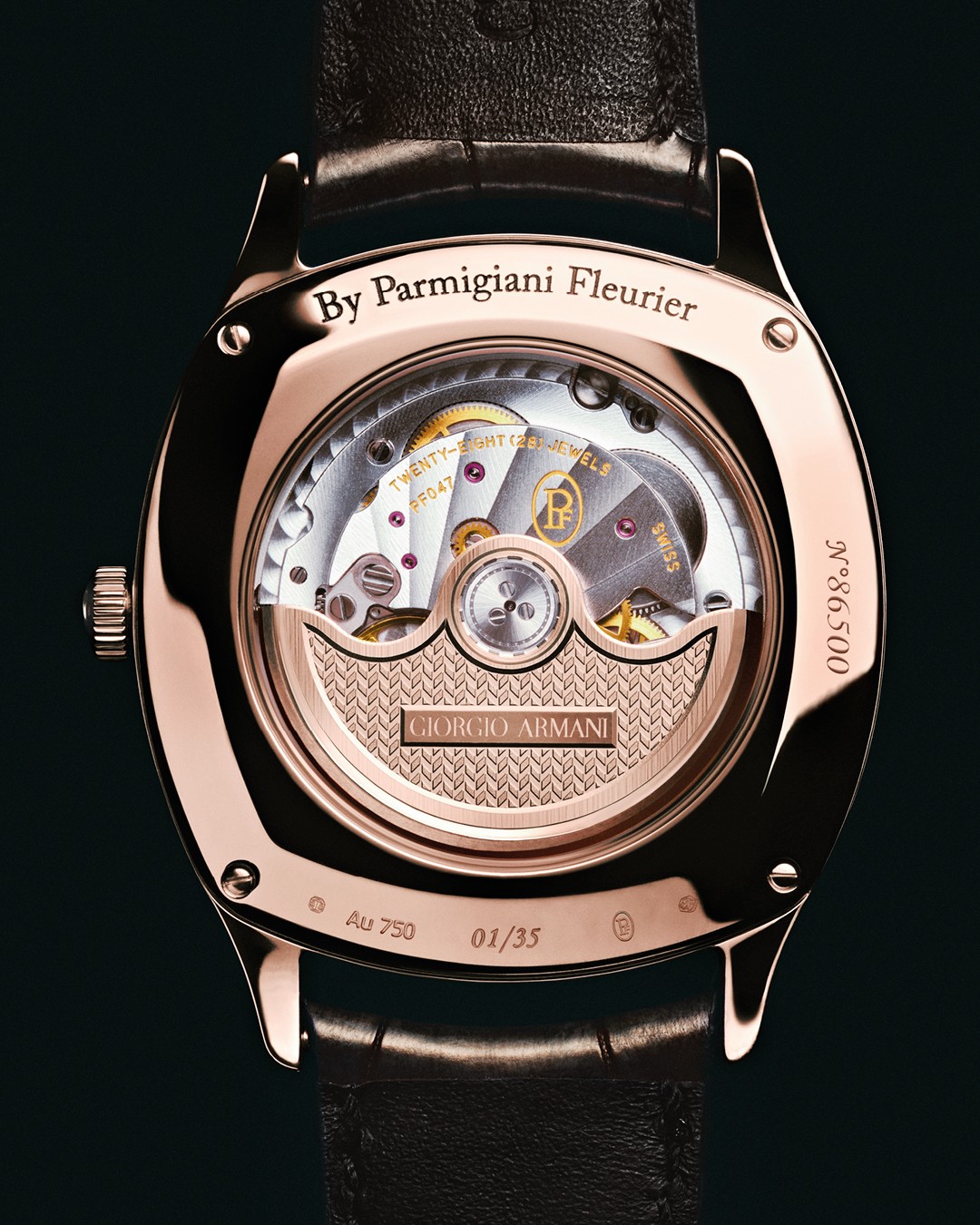 On the case back is the information that it is made for Armani by Parmigiani, and a sapphire case back, through which can be seen the automatic Parmigiani Fleurier Calibre PF047 with a metal-matched rotor, and again decorated with a herringbone pattern. It beats at 28,000 VPH and has a power reserve of 50 hours.