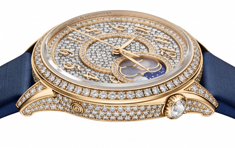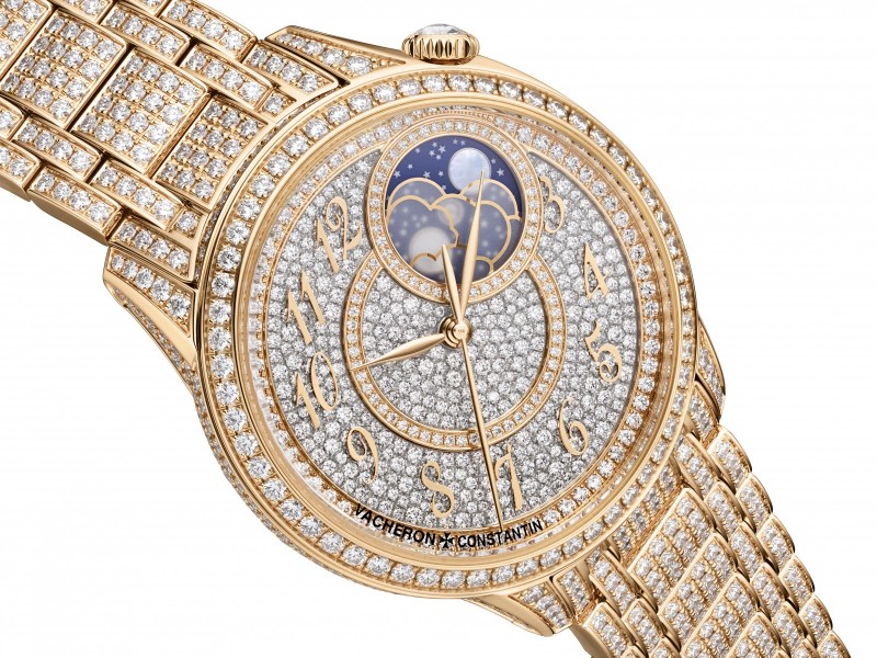 The case is set with 292 brilliant-cut diamonds, with a rose-cut diamond in the crown. Like the second model, the dial has an 18K white gold base, set with 510 brilliant-cut diamonds. The rings are 18K 5N pink gold and the moon is mother-of-pearl with a translucent sapphire crystal cloud. The applied numerals are 18K 5N pink gold.