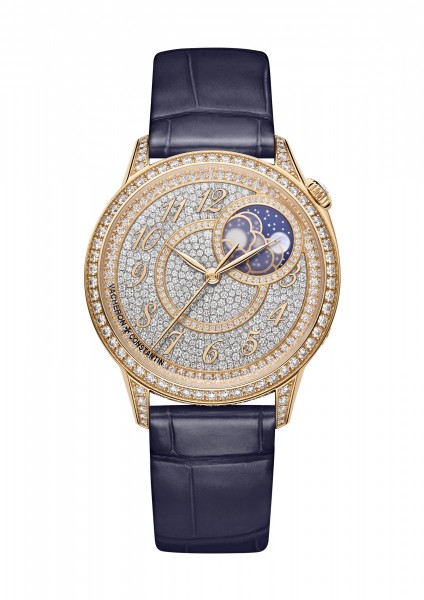 It comes with with two interchangeable straps – one in a dark blue Mississippiensis alligator leather strap and the other a similarly hued blue satin strap. They come with two 8K 5N pink gold pin buckles, each set with 21 round-cut diamonds.