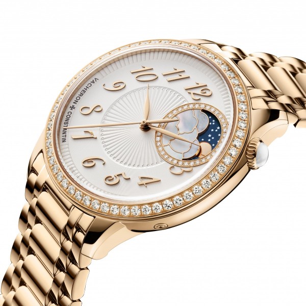 Vacheron Constantin’s Égérie collection has three new variants – the moon phase, the moon phase jewellery, and the moon phase diamond-paved, all in 18K 5N pink gold 37mm-sized cases. Both of the latter have dials and cases set with brilliant-cut diamonds on a white gold base, with a flange, central ring and moon phase rings in pink gold.