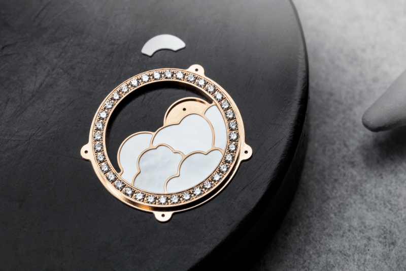 Its dial has an 18k white gold base which is set with 510 briliant-cut diamonds. The flange, central ring and moon phase ring are all 5N pink gold. The moon is mother-of-pearl and the cloud, translucent sapphire crystal. The applied Arabic numerals are 18K 5N pink gold.