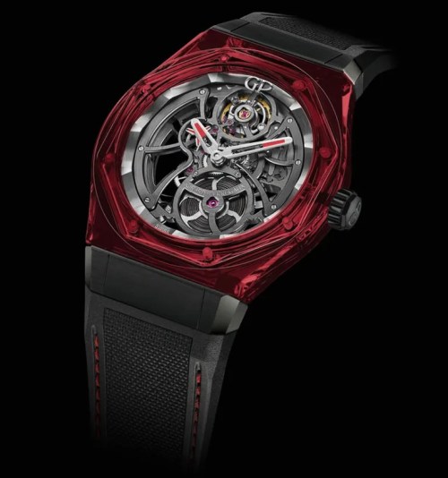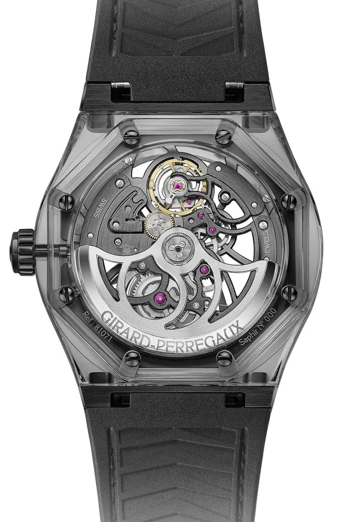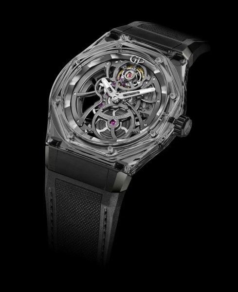 The new watches combine a sapphire crystal case with a skeletonised movement, with the mainplate of the Calibre GP01800-1143 octagonal-shaped, mirroring the bezel. The barrel and gold oscillating weights are open-worked. The bridges are NAC-treated and the movement features a mix of finishing types such as sand-blasting, traits-tirés, and circular satin finishing. The automatic movement beats at 28,800 VPH and has a power reserve of 54 hours.
