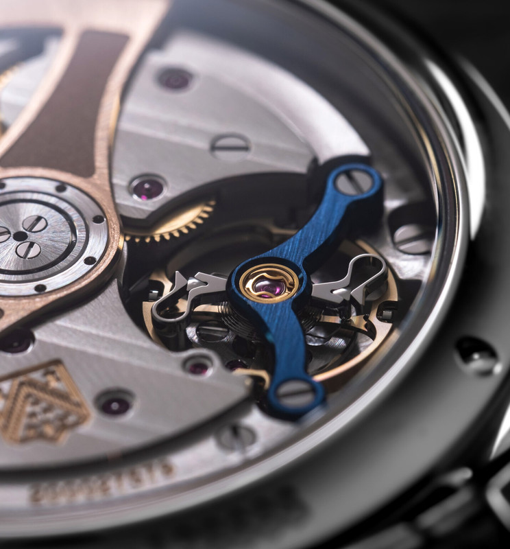 Visible through the open case back is the automatic Moser in-house Calibre HMC 200 which beats at 21,600 VPH and has a power reserve of 72 hours. It has an 18kt gold rotor and a blue balance bridge.