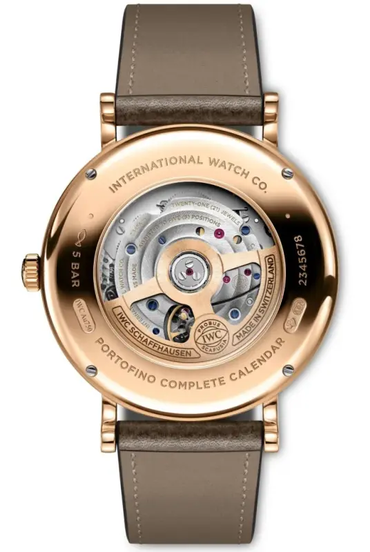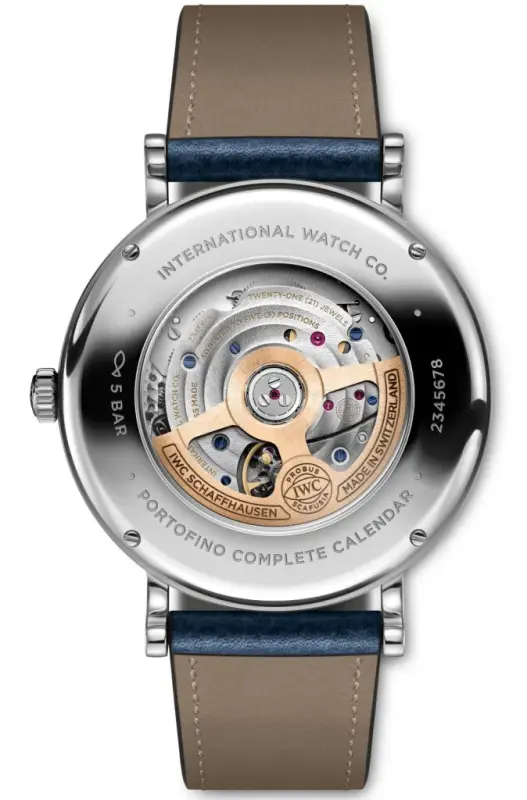 The new IWC Portofino Complete Calendar comes in two launch models, both in 41mm-sized cases with a thickness of 11.8mm and a water resistance of 50m. The Ref. IW359001 has a stainless steel case, silver-plated dial, gold-plated hands and applied markers, and comes on a blue calfskin strap. The Ref. IW359002 has an 18-carat 5N gold case, silver-plated dial, gold-plated hands, solid gold applied markers, and a taupe calfskin strap.
