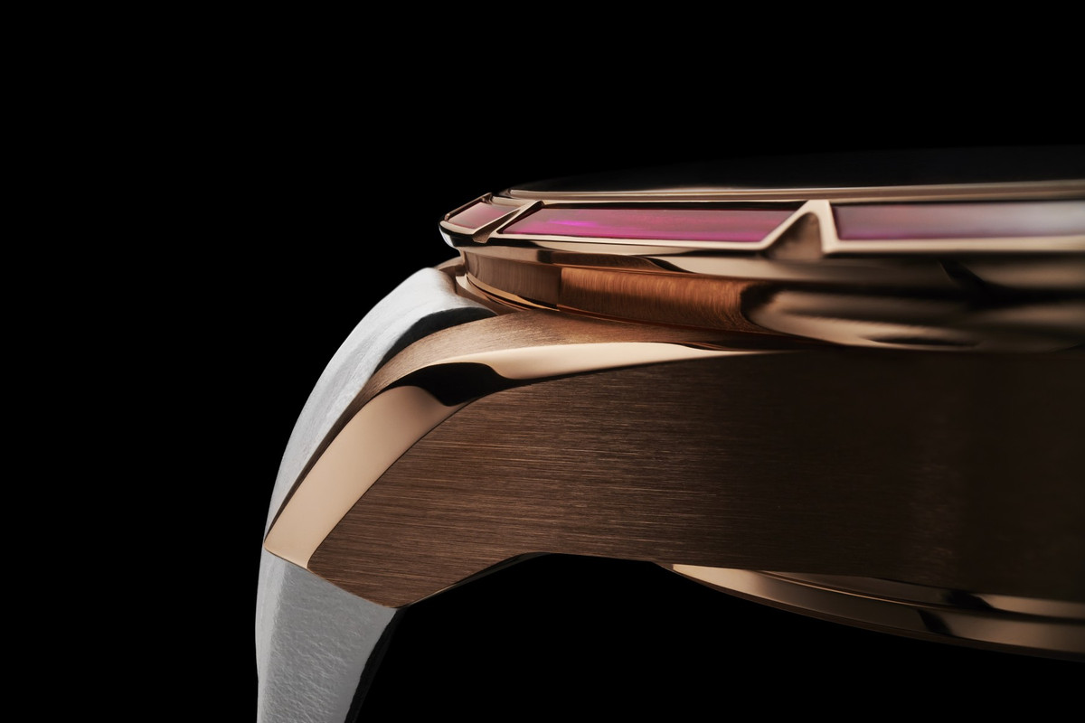 The dial side has polished pink gold-plated hour markers filled with Super-LumiNova. The hands are in 750/1000 pink gold with satin-brushed finishing on the angled surfaces and shot-blasted finishing on the (top) grey flat surfaces, with lumed tips.
