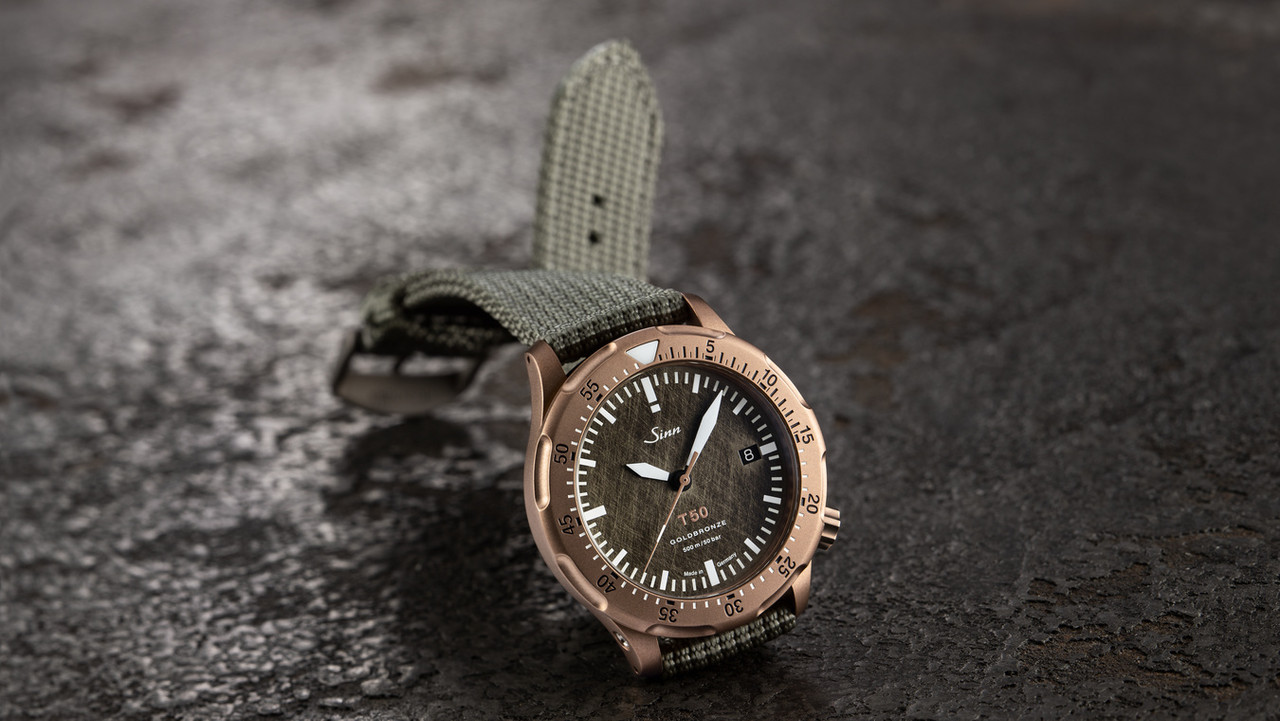 The Sinn T50 Goldbronze® is limited to 300 pieces but the T50 and T50 GBDR are part of the general collections. The Goldbronze comes on a textile strap but the other two have the choice of a matching titanium bracelet, leather strap, or silicone strap.
