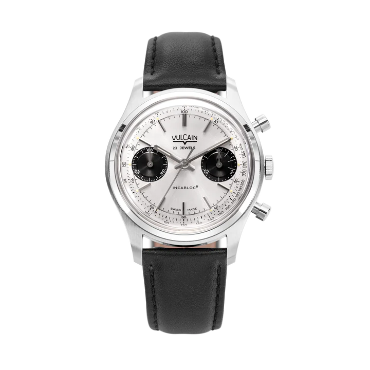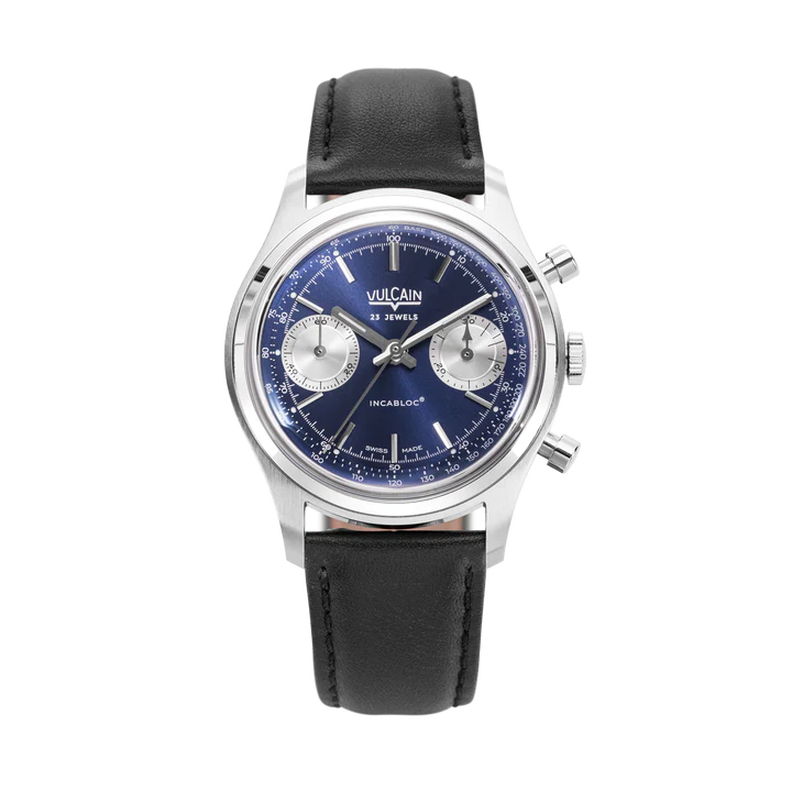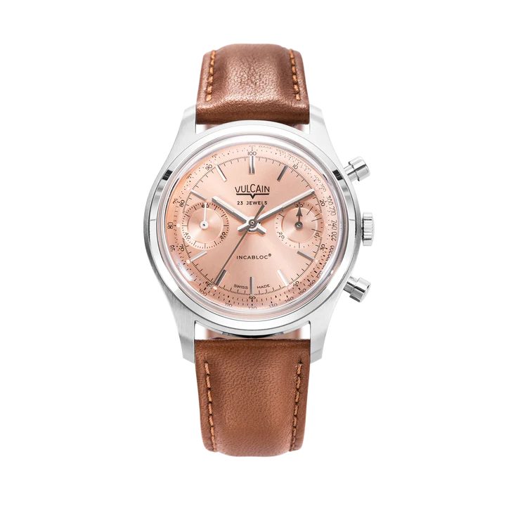 The 1970s chronographs from Vulcain came in a variety of models and case shapes, including cushion cases. This new model is based on a watch that had a blue dial and gray counters, but the 2023 model, in a 38mm sized steel case with four dial variants – black, blue, ‘panda’ black and silver, silver (limited edition of 100 pieces) and salmon (limited edition of 50 pieces). The dials all have sun-ray finishing.