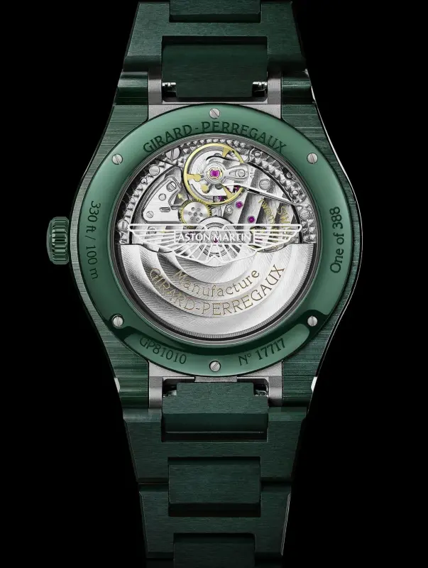Both size variants of the Laureato Green Ceramic Aston Martin Edition have automatic movements that are visible through a sapphire case back which has a decal of the Aston Martin logo.