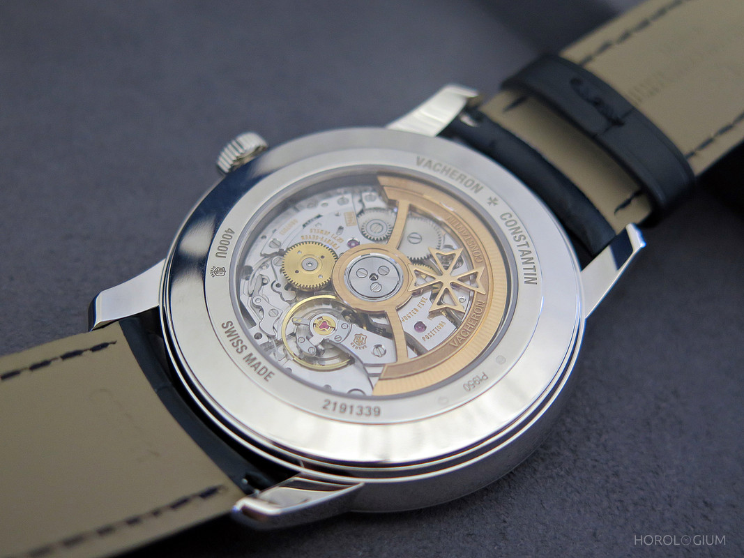 The Patrimony retrograde day-date is powered by the in-house automatic Calibre 2460 R31R7/3 i has a 22k gold open-worked rotor and beats at 28,800 VPH with a power reserve of 40 hours. The bridges are finished with hand-polished angles, and there is straight-graining, circular-graining, and the bridges have the Côtes de Genève.