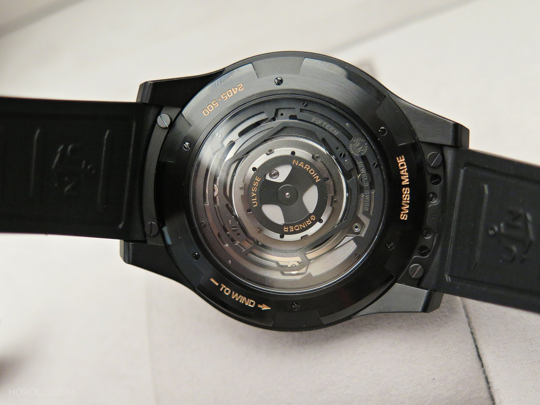 Powering this watch is the new automatic UN-240, which has a 72 hour power reserve. It has their patented Grinder® winding system which features four blades connected to the oscillating weight. The new Freak ONE has an oversized silicon balance wheel and a lever escapement executed in DIAMonSIL (a patented form of diamond-coated silicon).