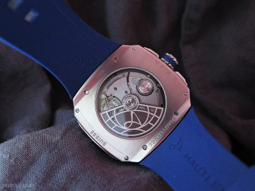 Through the sapphire case back can be seen the automatic calibre B30 which beats at 21,600 VPH and has a power reserve of three days. The back also features the Hautlence name and Black Badger logo.