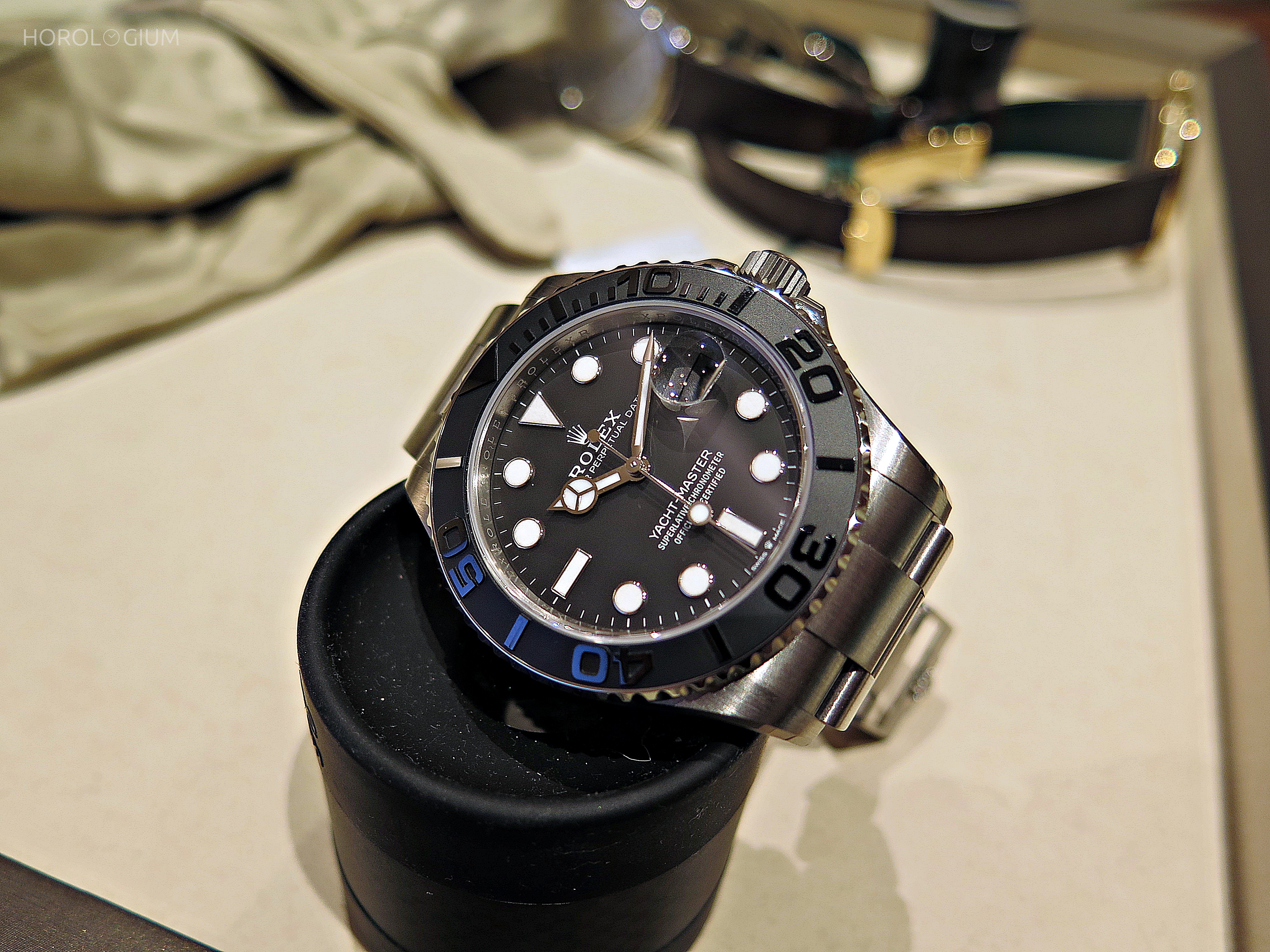 The Yacht-Master 42 in RLX titanium has a Monobloc middle case, screw-down case back and winding crown, and is waterproof to 100m. There is a bidirectional rotating 60-minute bezel with matte black Cerachrom ceramic insert with polished raised numerals and gradations against a matte-sand-blasted background.