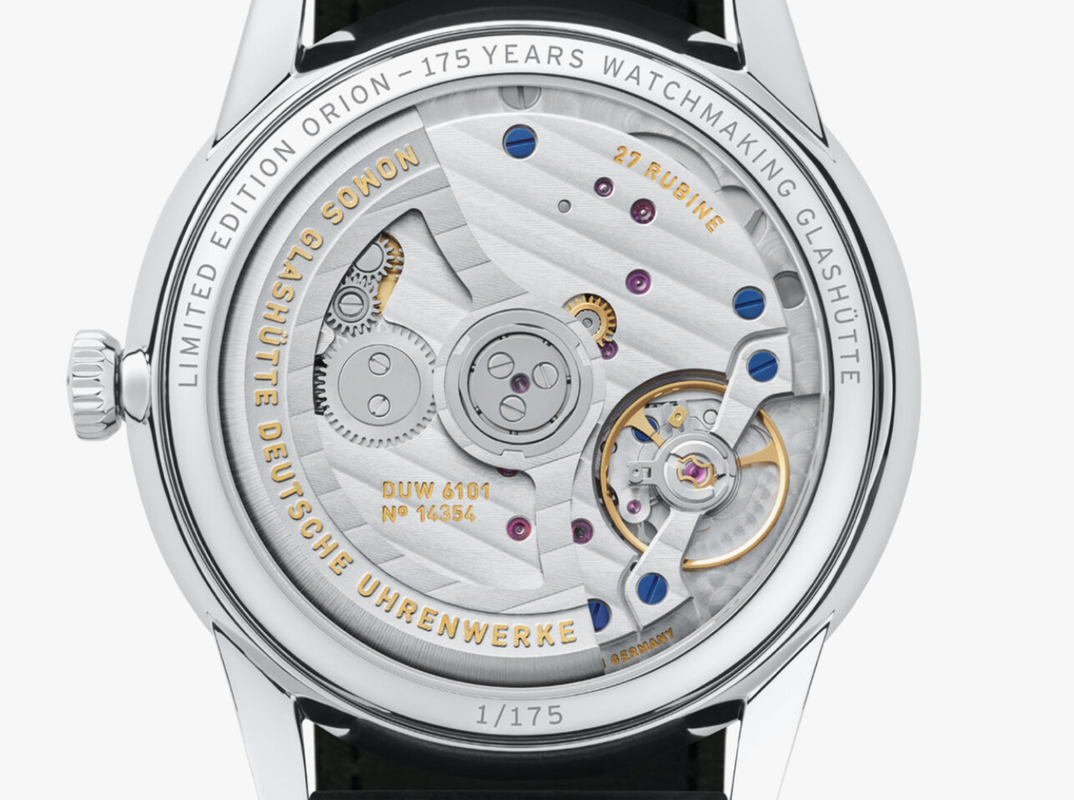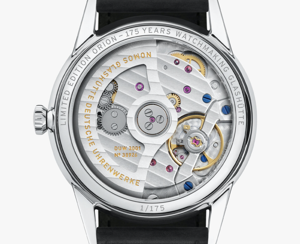 As is the case for the two smaller models, on the back of the Orion neomatik 41 is an engraving of ‘Limited Edition Orion – 175 Years Watchmaking Glashütte X/175’.