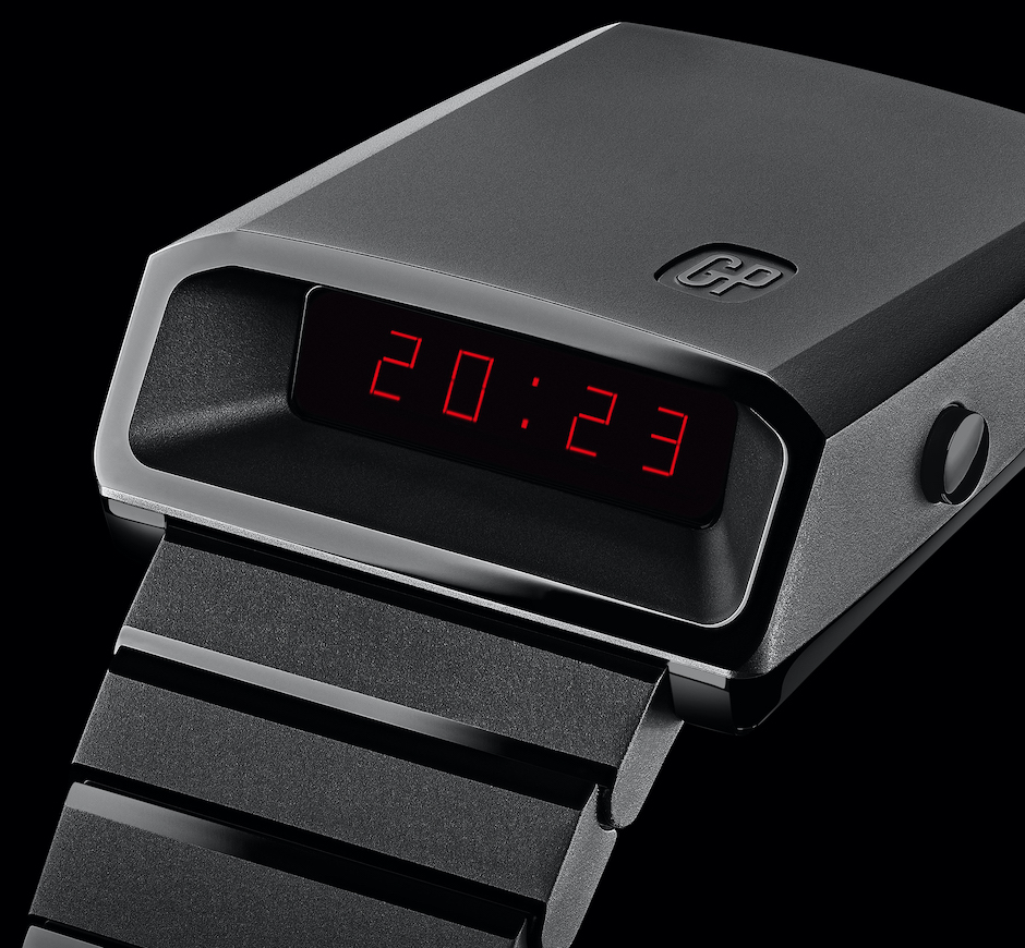 The LED display remains the same, with functions of hours/ minutes/ seconds, day, date, month, year, chronograph, a second time zone, and a ‘secret date’ – you save a date and it will be displayed at a time specified by you. The pushers used to select the functions are titanium.