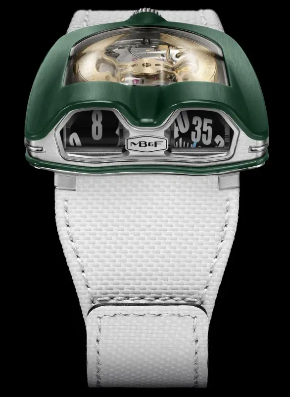 The case measures 47mm x 41.5mm x 19mm and has a water resistance of 30m. It is made of grade 5 titanium with British racing green or white CarbonMacrolon® panels, and the case has a combination of matte and polished finishing. CarbonMacrolon® is a composite material developed for MB&F and is composed of a polymer matrix injected with carbon nanotubes.