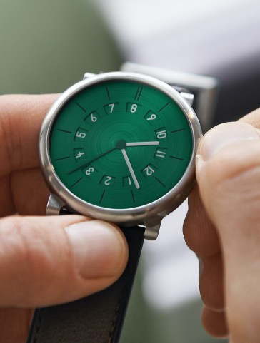 The due ore uses an adjustable moving time zone disc to display two time zones using just a single hand. The indices display the primary time and the adjustable disc displays the second time zone.