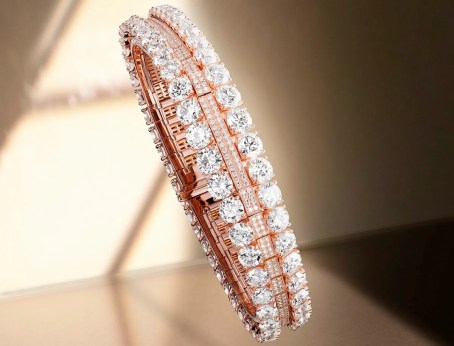 The new ‘Secret’ is also a new design. In pink gold and set with diamonds totalling almost 27 carats, it has a rivière-style bracelet featuring a new mechanism that reveals the secret (aka the dial) on demand.