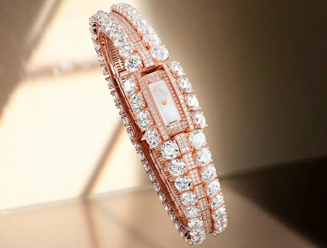 With a mother-of-pearl dial and a total of 1,024 diamonds (26.75 carats), it features a design defined by four rows of stones – two outer rows of claw-set diamonds set on either side of a double row of grain-set diamonds. The profile of the bracelet is also set with diamonds. The gem-setting requires 182 hours to complete and the stones are (basically imperceptibly) graduated in sizing.