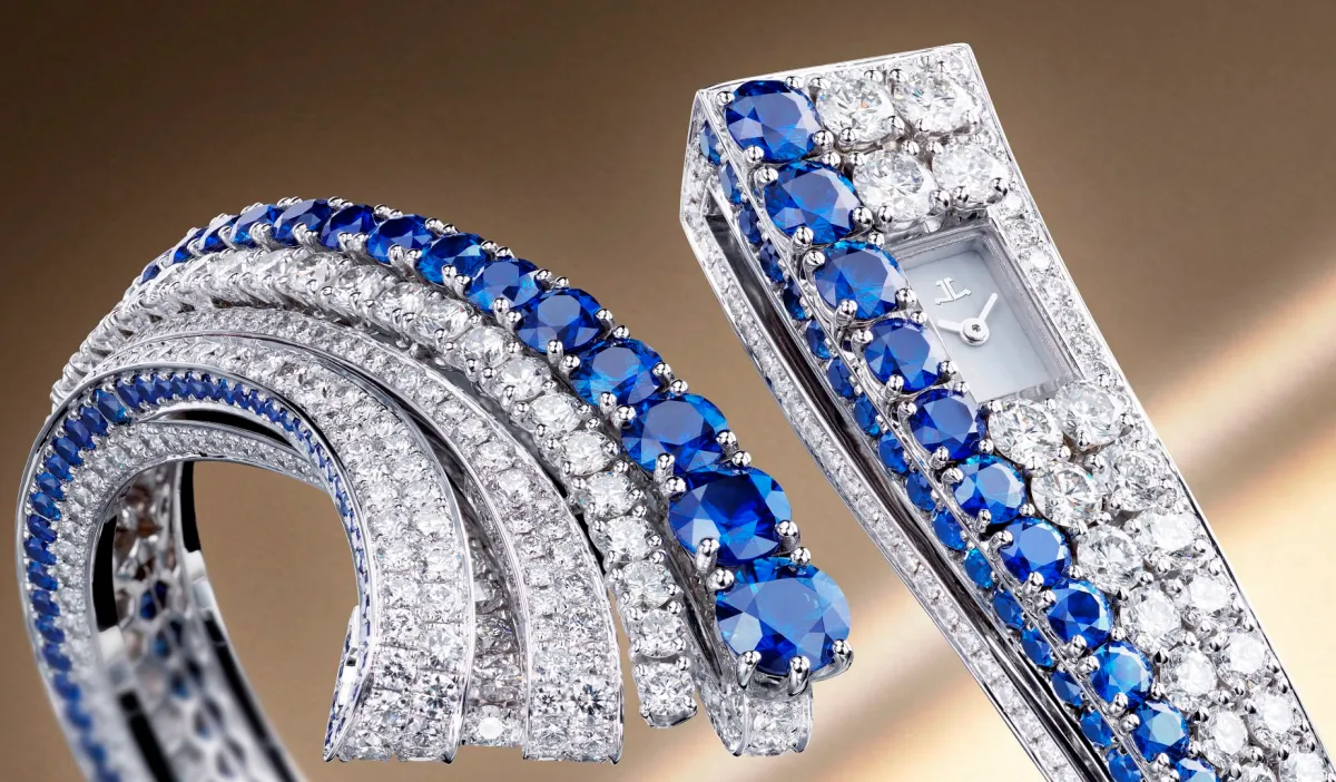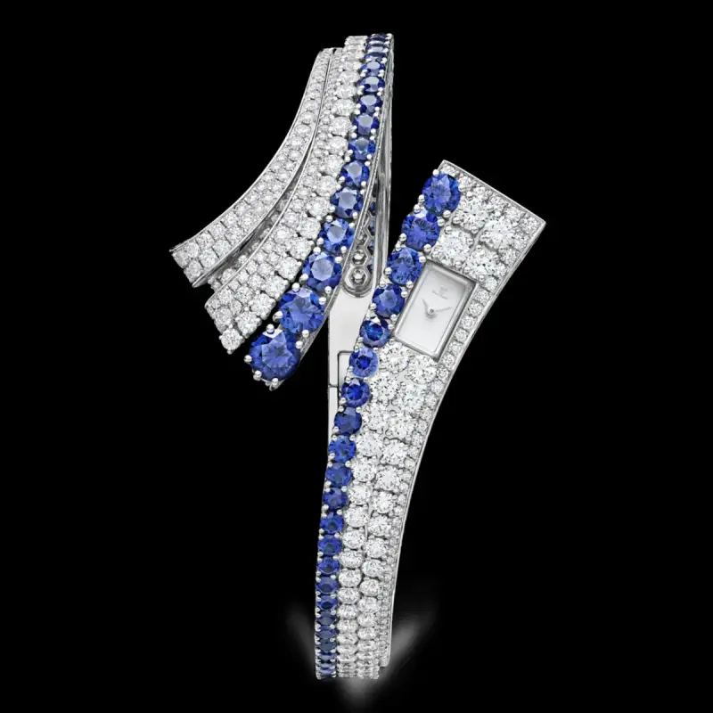 It features a row of brilliant-cut sapphires, graduating in size and wrapping around the wrist. There are also sapphires set into the profile of the bracelet, along with white diamonds for a total of 347 sapphires (10.29 cts) and 645 diamonds (10.99 cts). The dial is more low key for this piece – white lacquer.