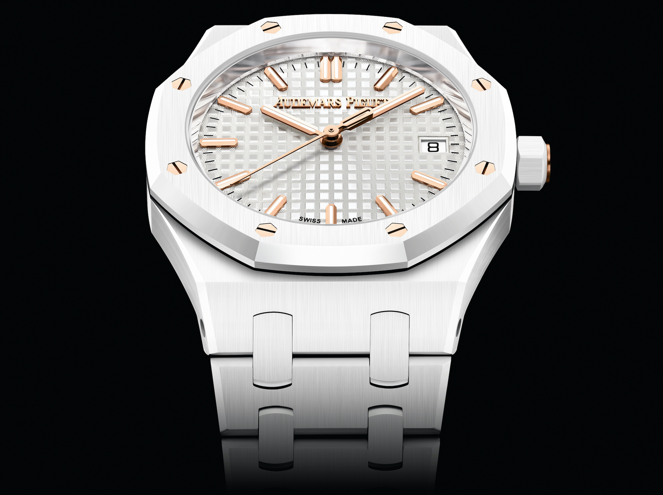 This white ceramic Royal Oak 34mm comes on a white ceramic integrated bracelet with an AP folding clasp with black DLC treatment blackened polished steel.