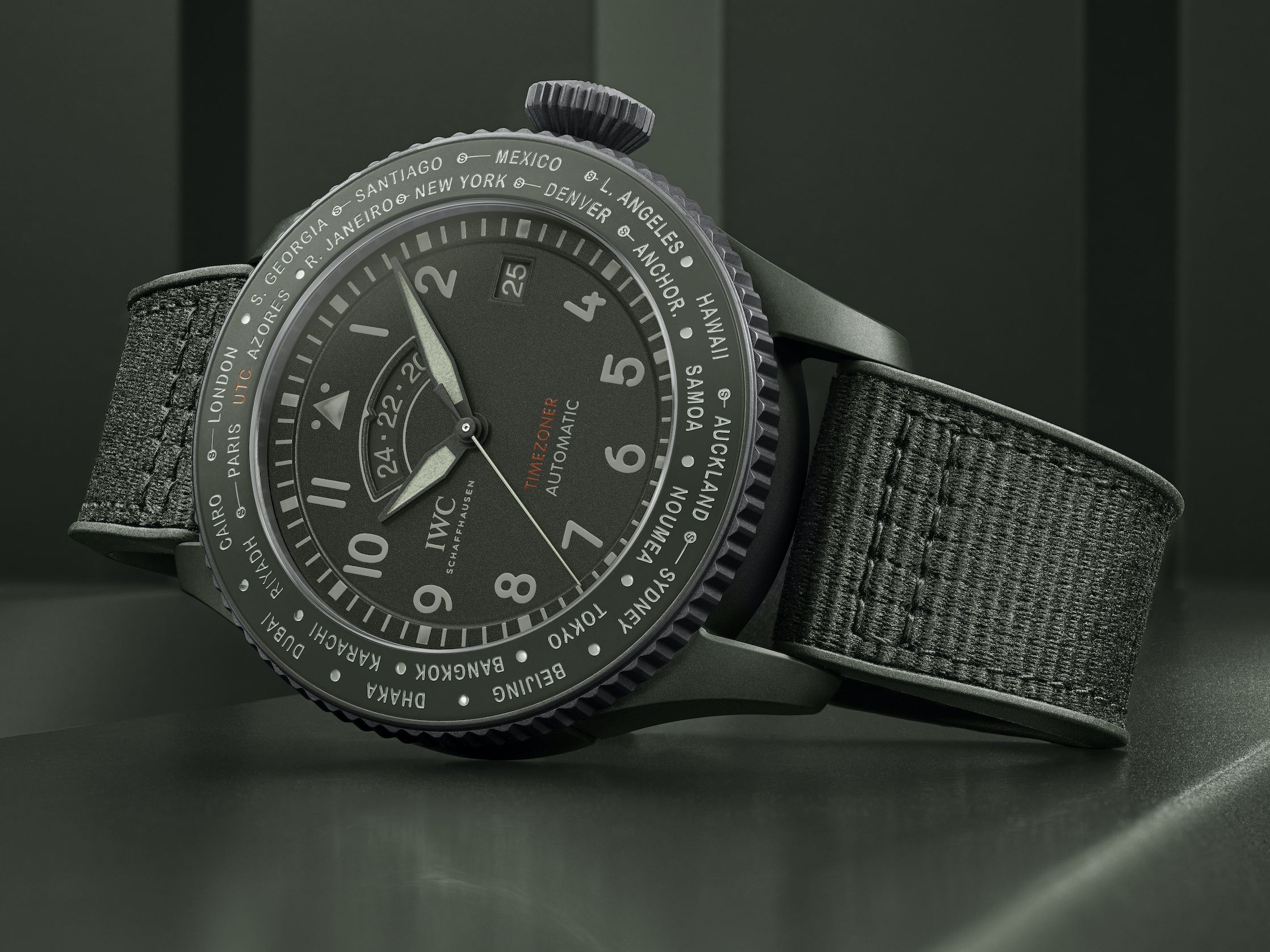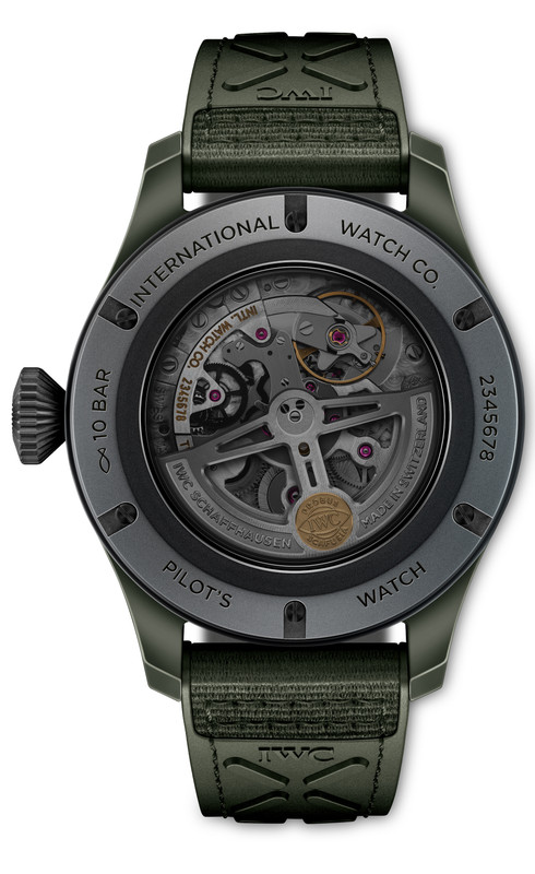 First up – the Timezoner TOP GUN Woodland (Ref. IW395601) is the first Timezoner in a coloured ceramic case – dark green, with a Ceratanium case ring and crown. The case is 46mm with a thickness of 15.1mm and is water resistant to 100m.