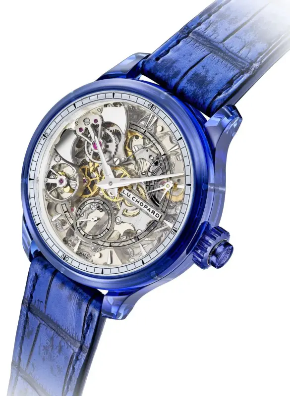 In 2022, Chopard launched a trilogy of L.U.C Full Strike models – the L.U.C Strike One, L.U.C Full Strike Tourbillon, and L.U.C Full Strike Sapphire. The final ones of these was in a five piece limited edition and featured a minute repeater in a transparent sapphire case. Its case, crown and dial were all cut from blocks of sapphire, allowing a full view of the COSC-certified Calibre L.U.C. 08.01-L, which allowed an uninterrupted view of the repeater’s gongs. It was the first minute repeater timepiece in this case material.